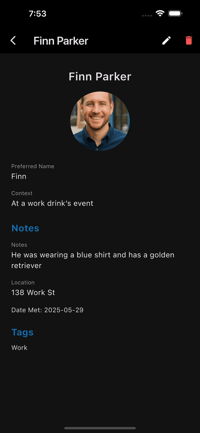 - Name Bank: Store and organise the names you want to remember, with the option to add details like notes, location, photo, and tags (depending on your account type).